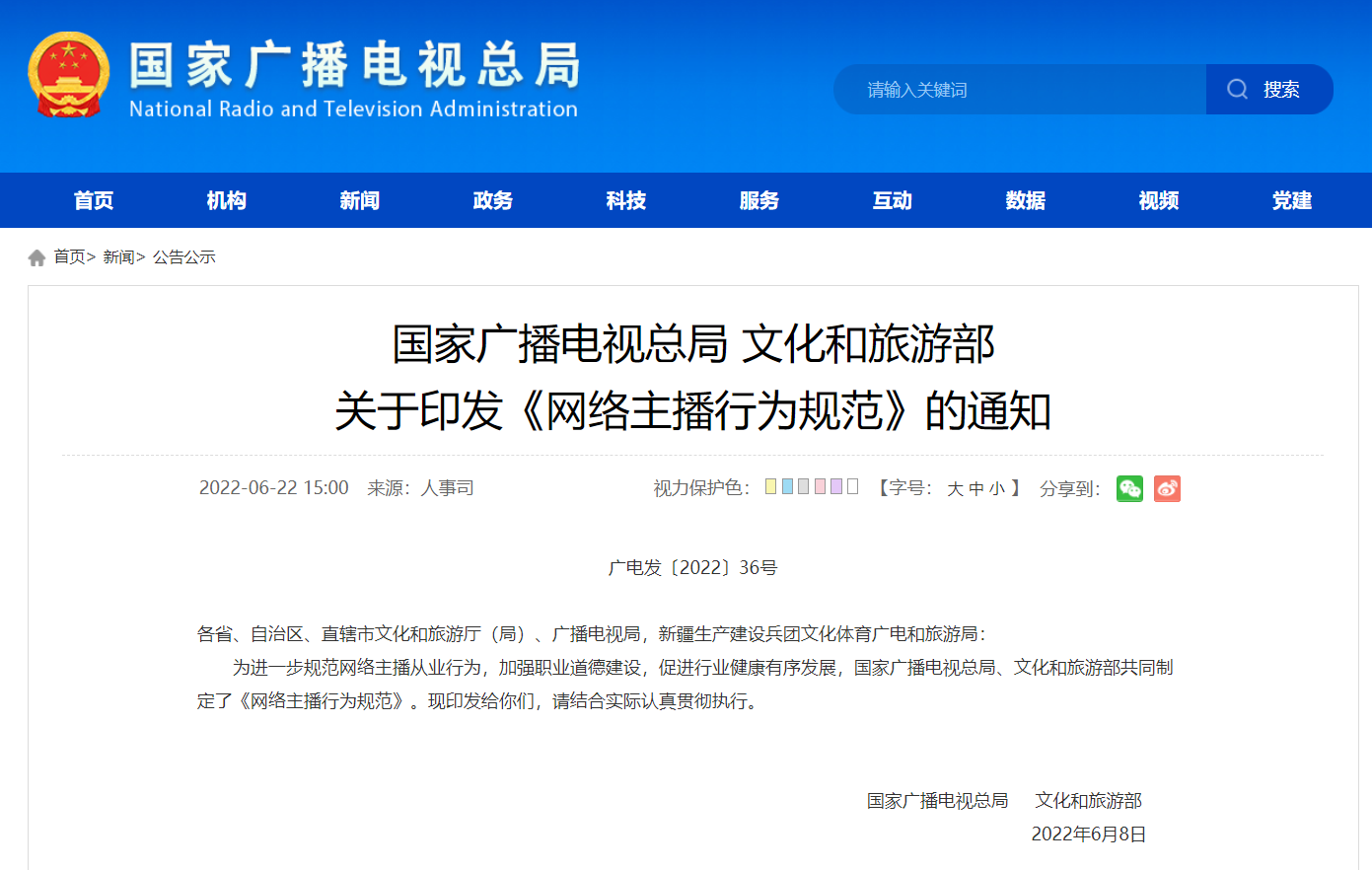 为加强规范管理,国家广播电视总局在广泛开展专题调研的基础上,会同文化和旅游部共同起草形成了《网络主播行为规范》。